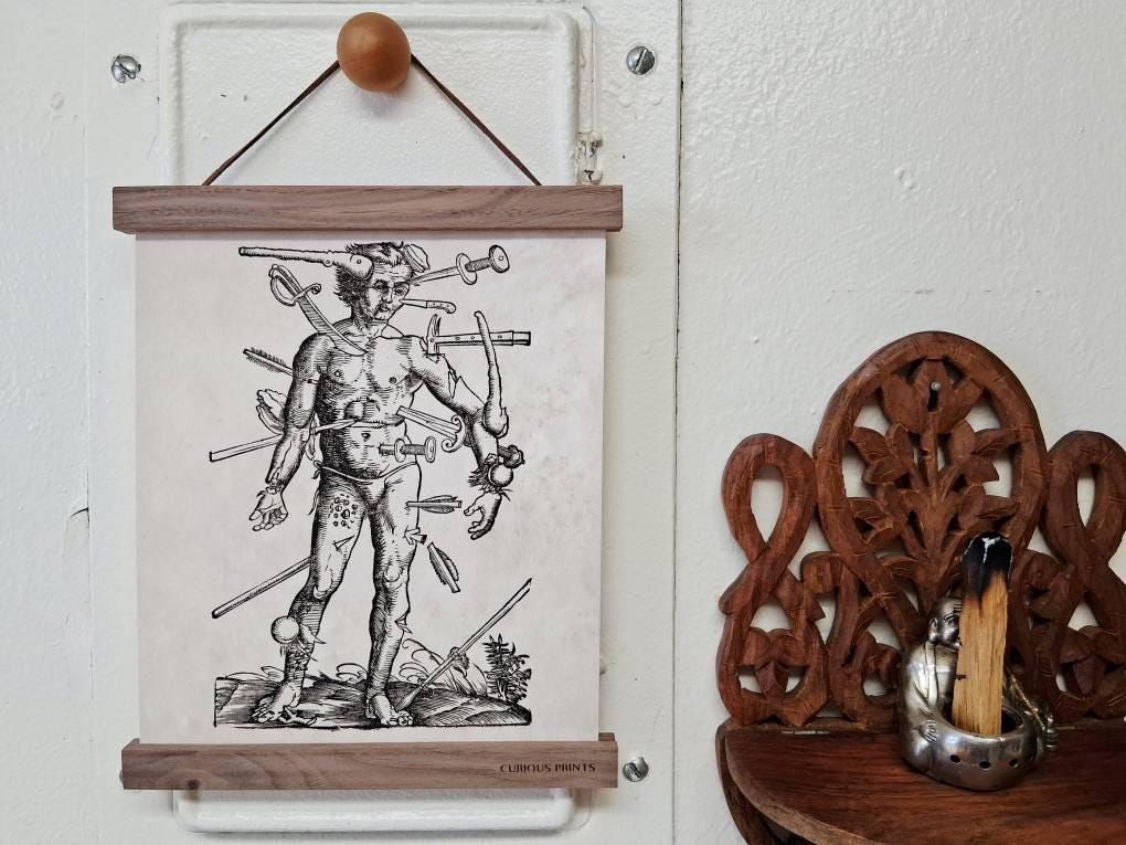 The frame set includes 4 sticks, 2 clamping the top of paper and two clamping the bottom. Neodymium magnets are embedded, keeping the art damage free and allowing you to change out the art at any time! The frame set comes with velvet cord hanger attached.