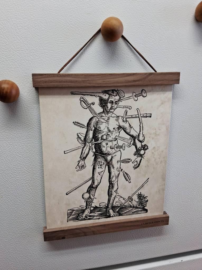 Curious Prints creates high quality reproductions of your favorite vintage art. This print comes from "Feldbuch der Wundarzney" (Field book of Surgery, 1517) illustrated with wood cut works attributed to Hans Wechtlin. The art has been scanned and retouched to ensure the highest quality reproduction possible. The art is digitally printed on sustainably produced 100% cotton fiber archival paper.