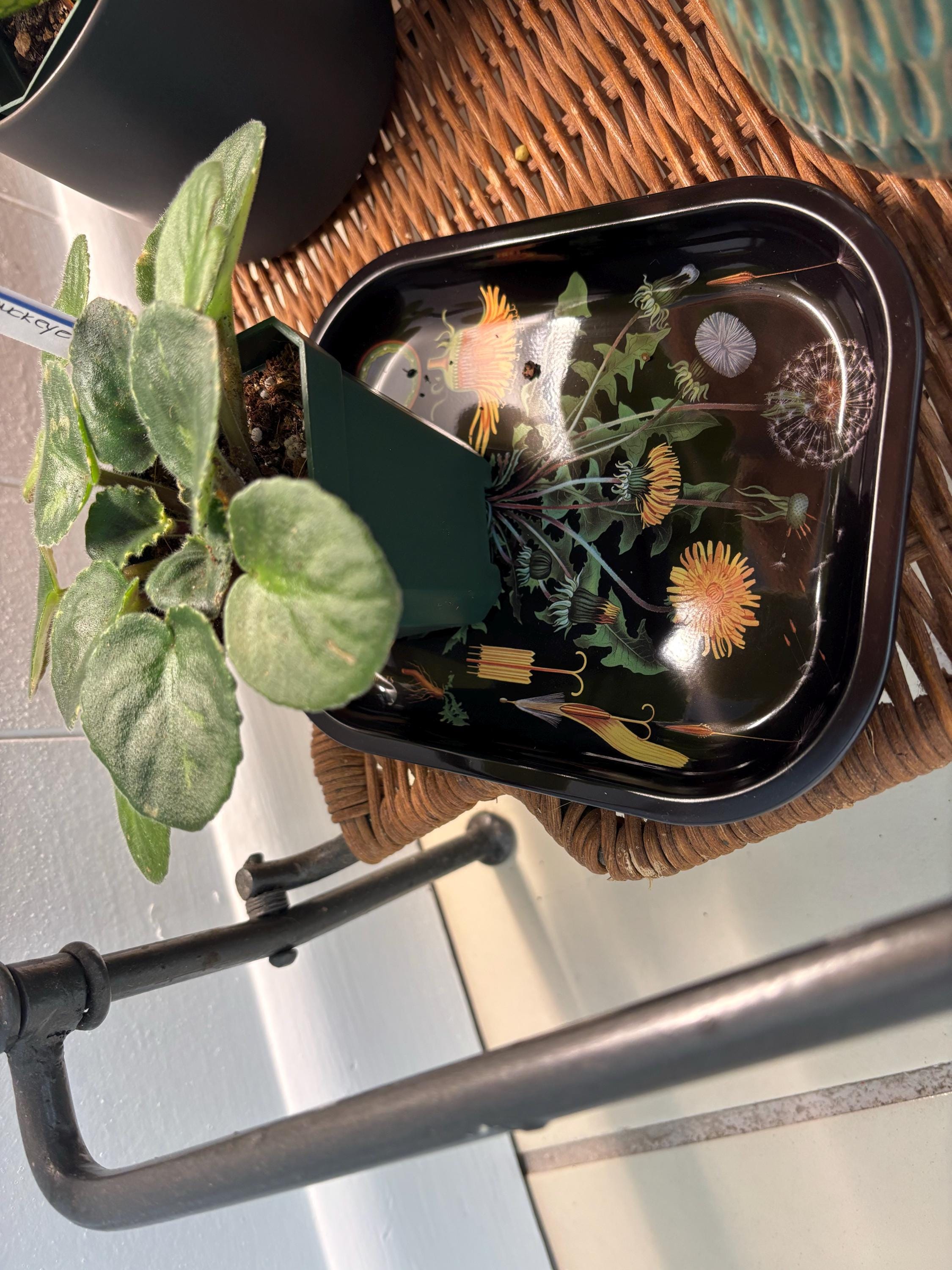 It’s a very unique & old fashioned metal tray. It’s charming and I have it holding a tiny plant instead of a saucer. It adds character to the display.