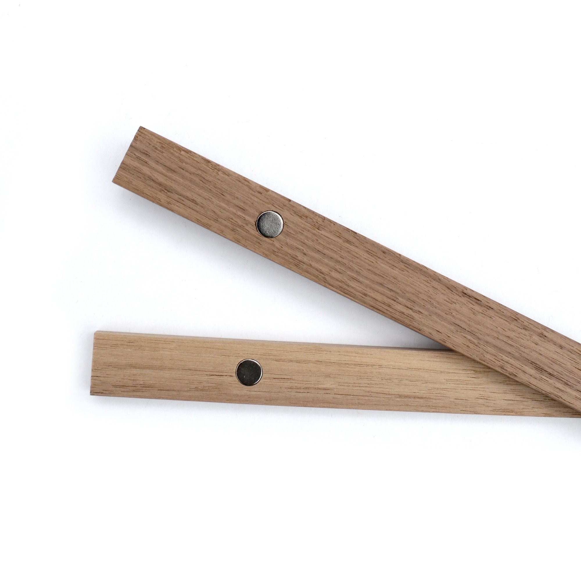 The frame set includes 4 sticks, 2 clamping the top of paper and two clamping the bottom. Neodymium magnets are embedded, keeping the art damage free. The frame set comes with velvet cord hanger attached.