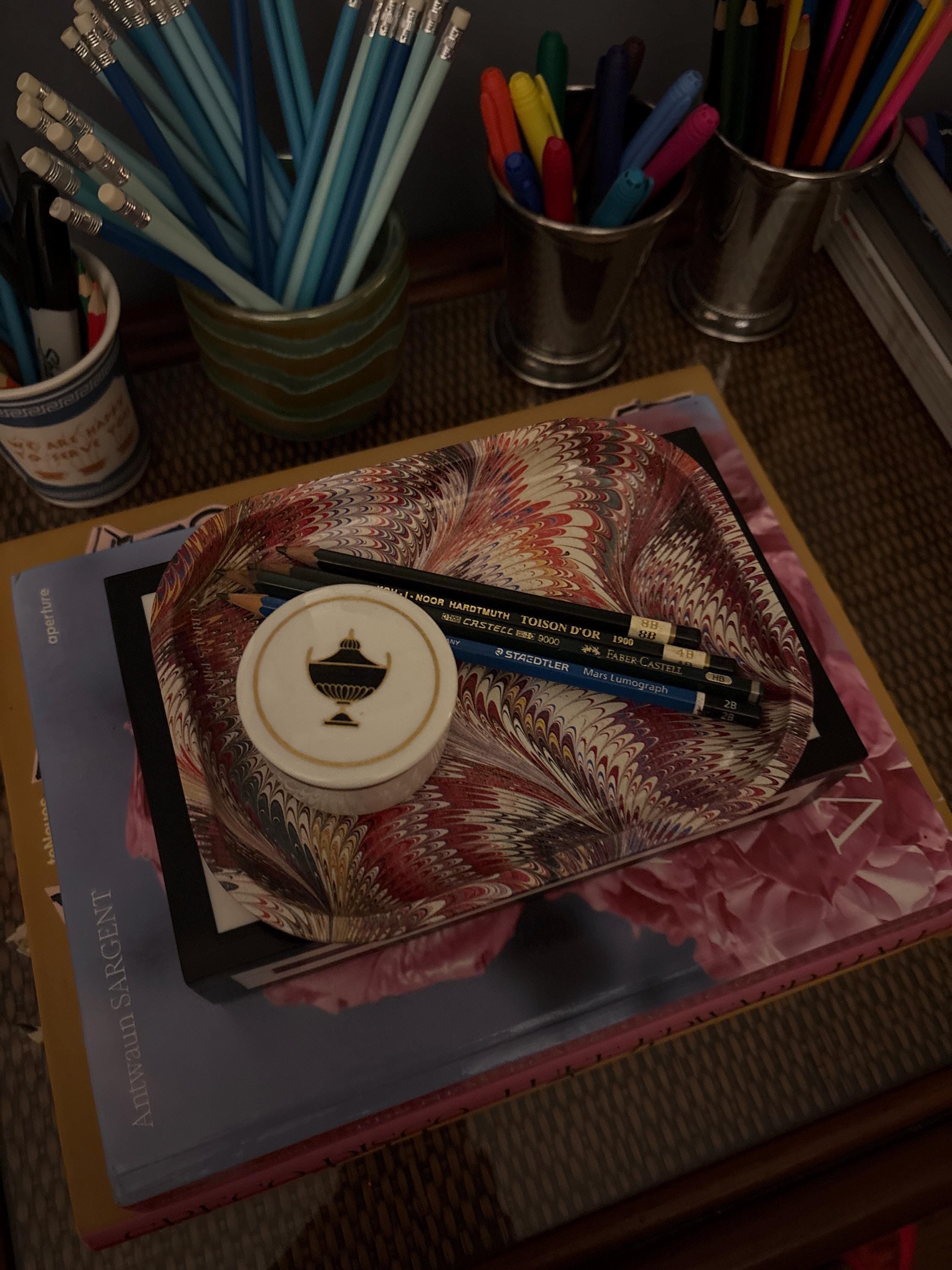 5"x7" tray made of sturdy metal (will not bend). Features unique vintage marbled swirl pattern sourced from historic papers.